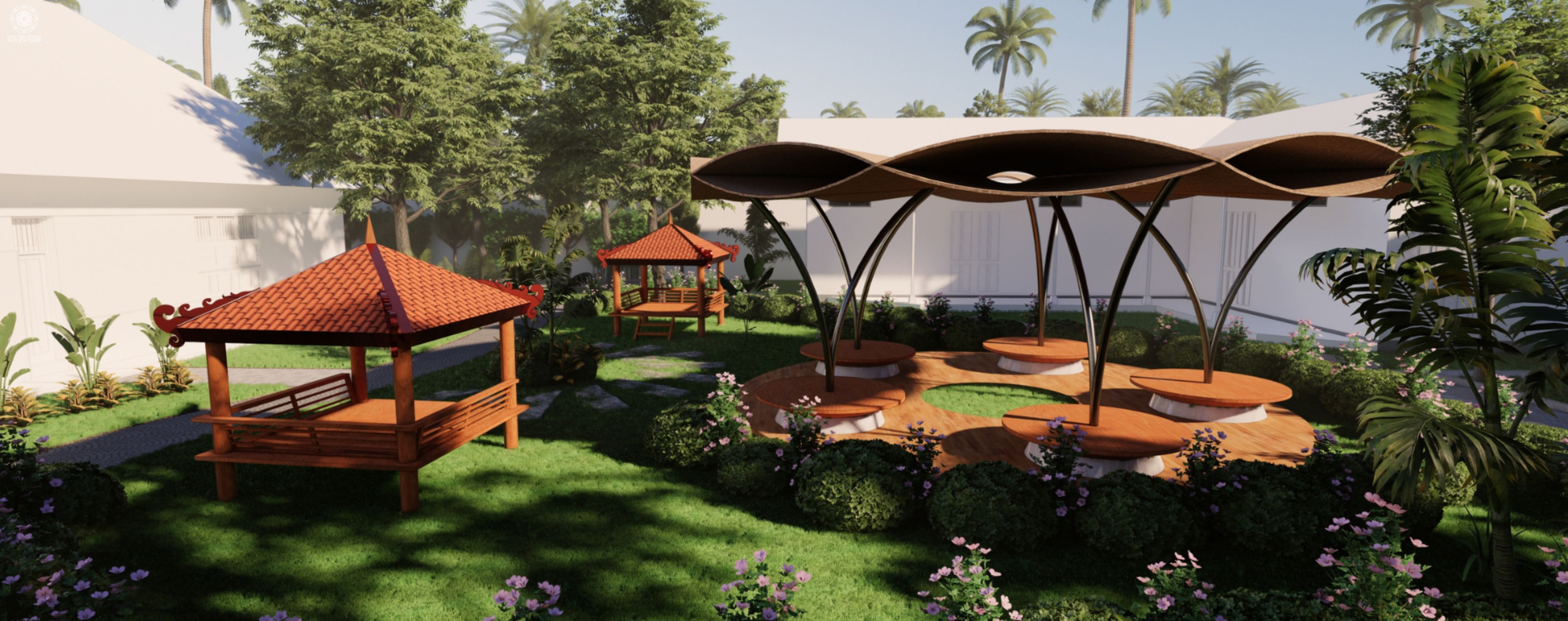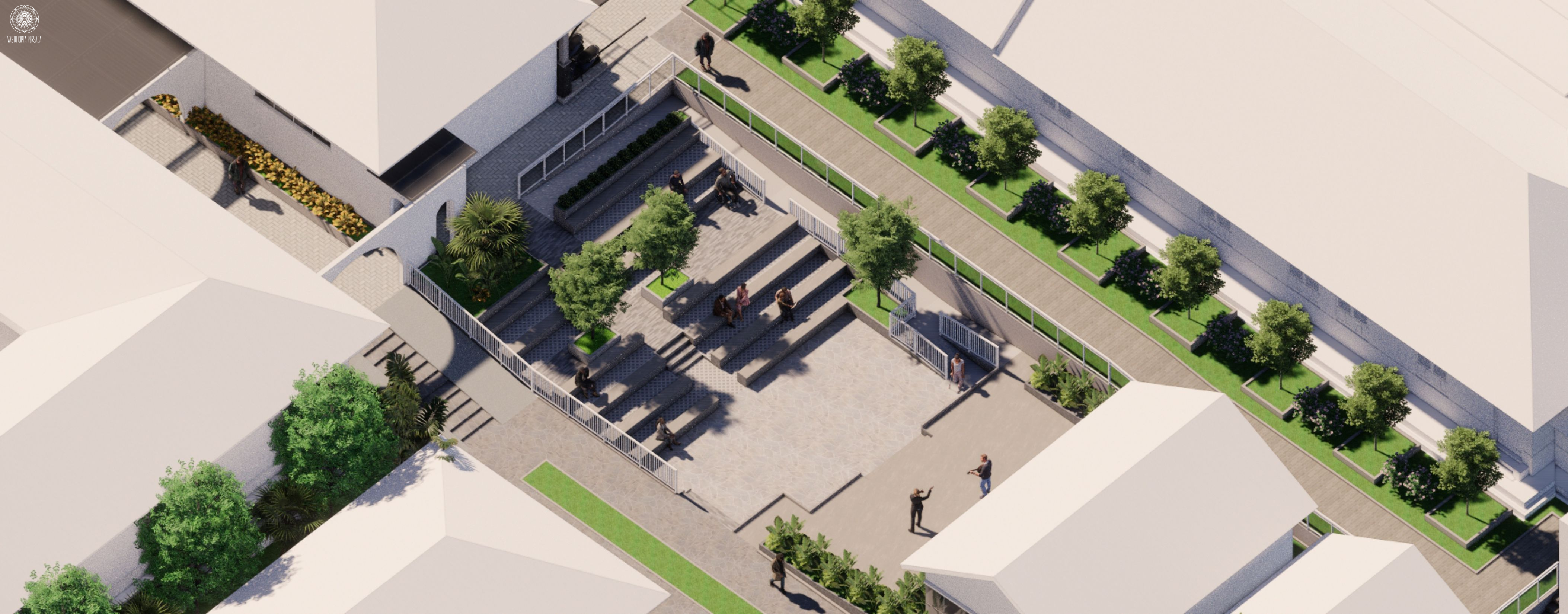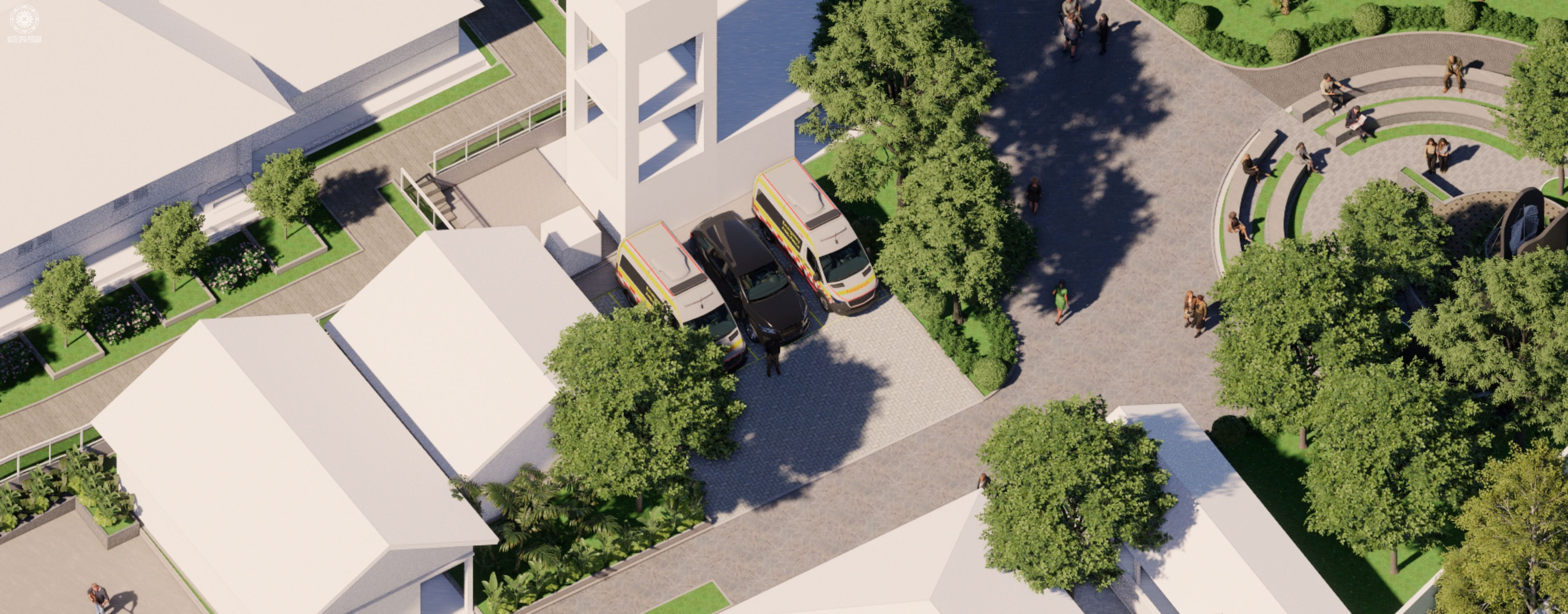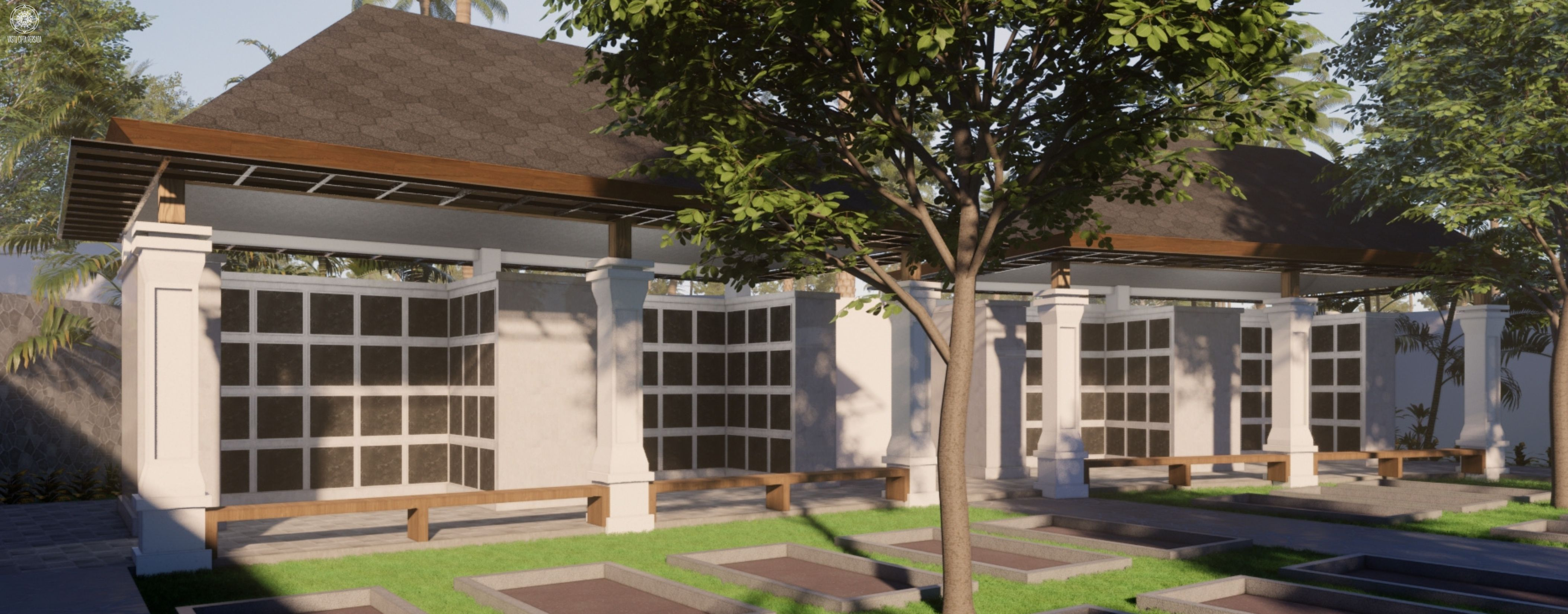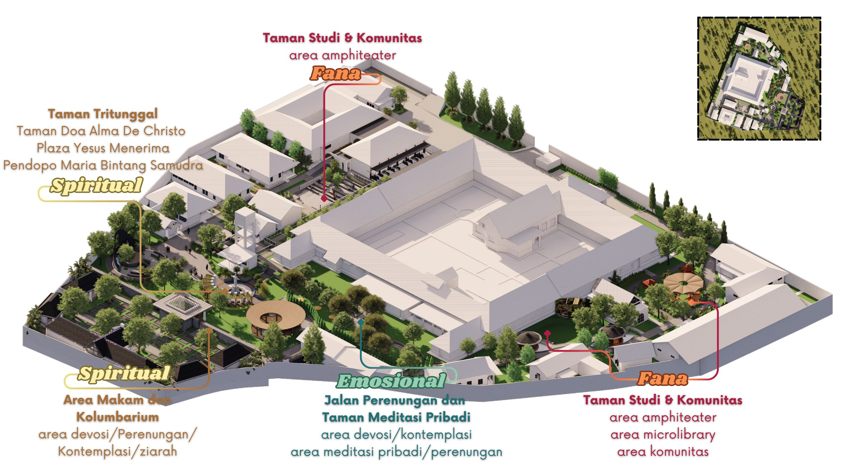 Bangunan dibangun dengan kontemplasi siteplan sebagi berikut. FANA sebagai area Community Plaza, Micro Library, dan Amphiteater Studi. EMOSIONAL sebagai jalan perenungan dan area meditasi pribadi. SPIRITUAL yang merupakan Pendopo Maria Bintang Samudra dan Taman Doa Corpus de Christo. Area Umum yang merupakan Amphiteater dan Parkir Karyawan. Serta Makam dan Columbarium.