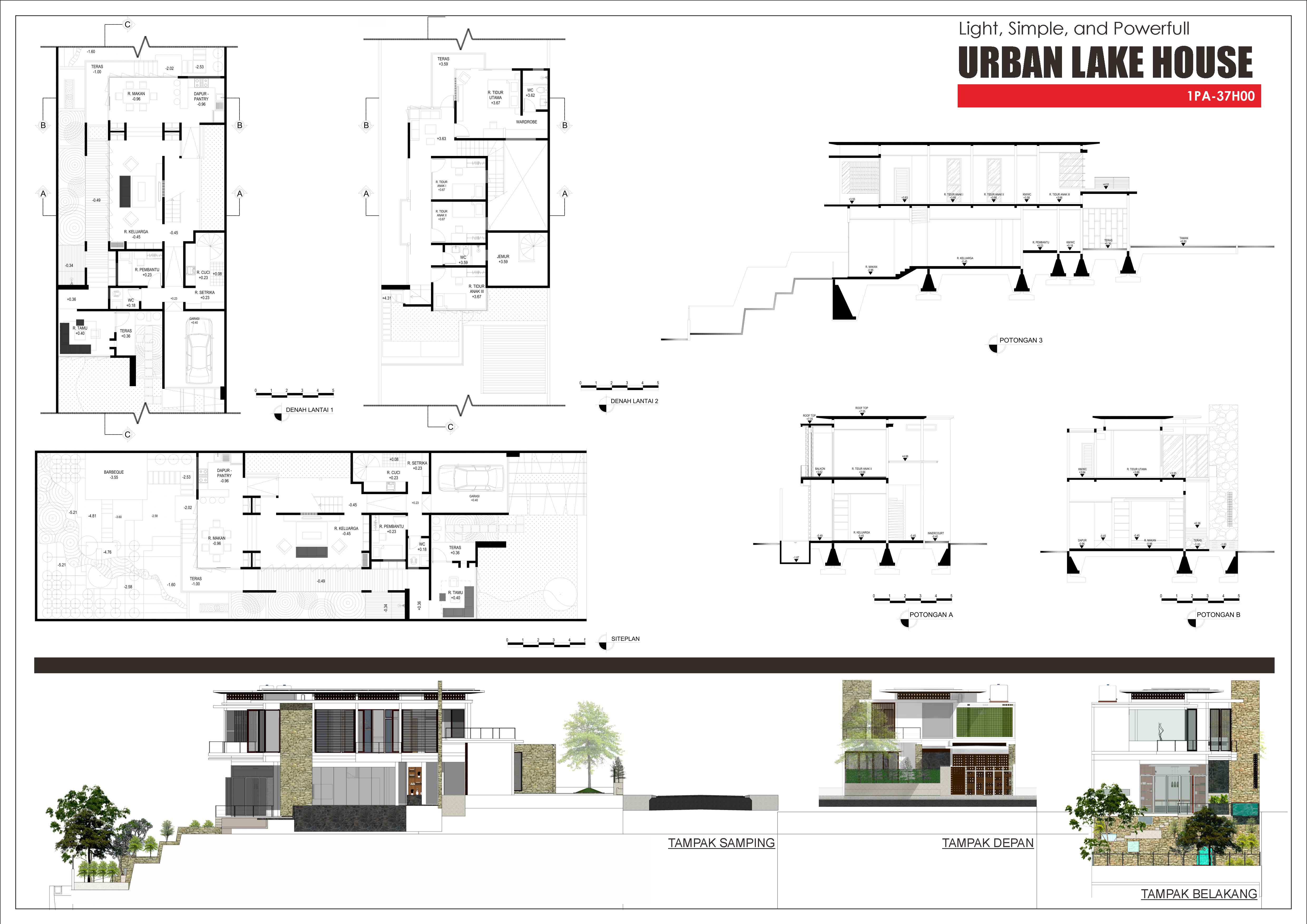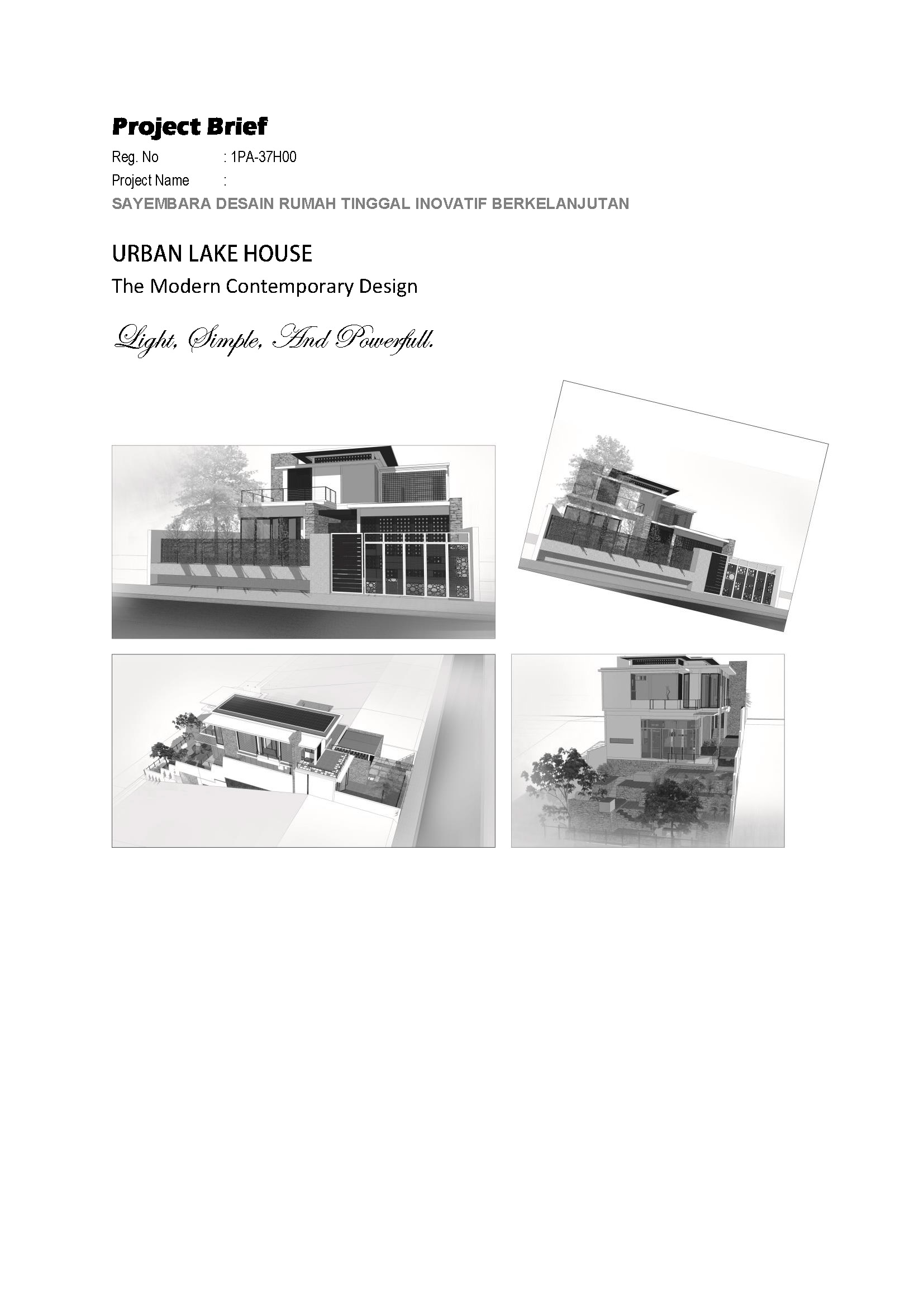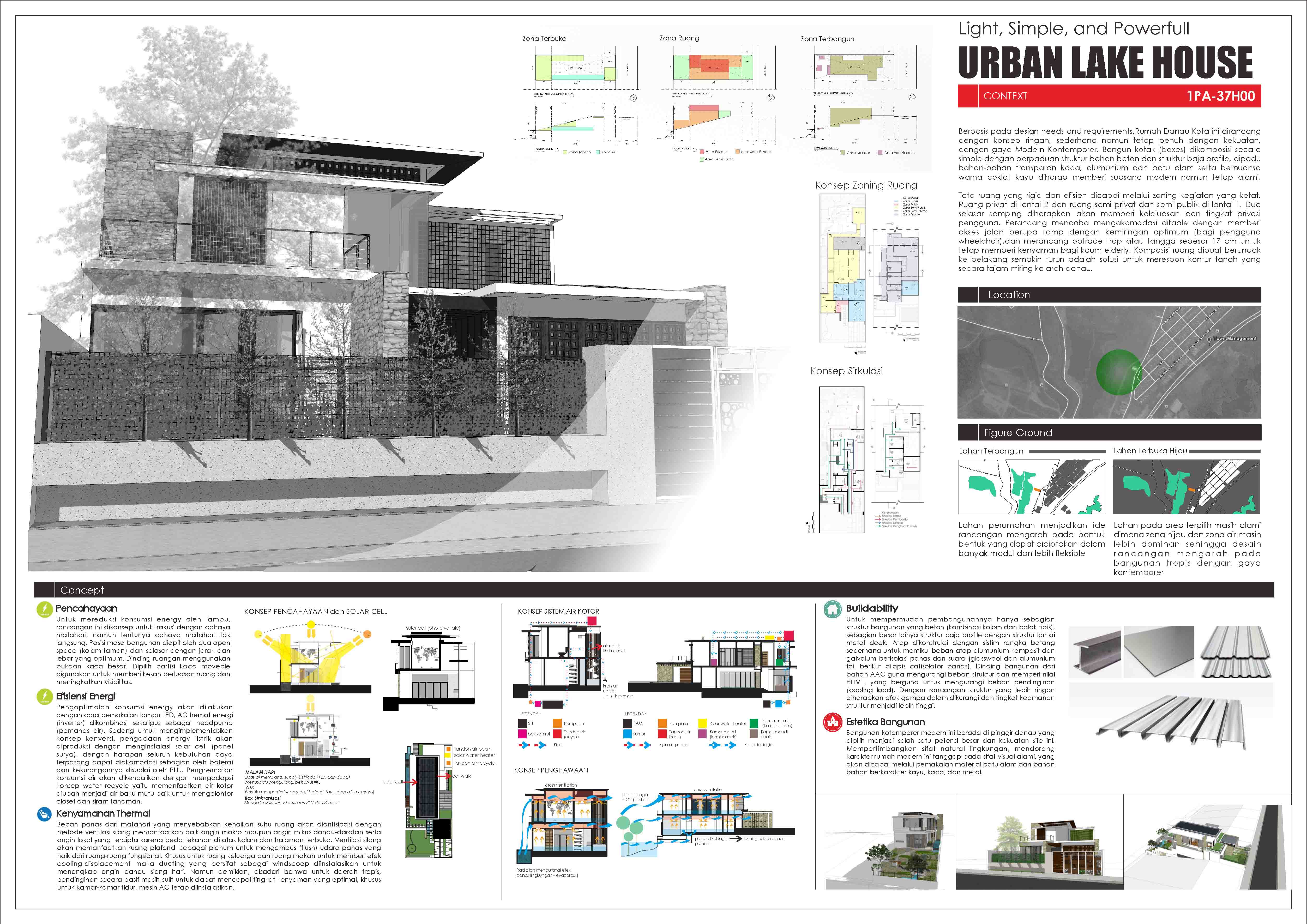 Berbasis pada design needs and requirements, Rumah Danau Kota ini dirancang dengan konsep ringan, sederhana namun tetap penuh dengan kekuatan. Rancangan rumah kota (urban House), dengan gaya Modern Kontemporer dipilih untuk mengakomodasinya. Bangun kotak (boxes) dikomposisi secara simple dengan perpaduan struktur bahan beton dan struktur baja profile, dipadu bahan-bahan transparan kaca, alumunium dan batu alam serta bernuansa warna coklat kayu diharap memberi suasana modern namun tetap alami.